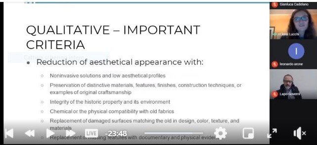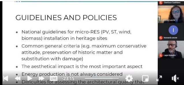 L’articolo scientifico “A conceptual framework on the integration of solar energy systems in heritage sites and buildings” realizzato da Elena Lucchi (EURAC Resarch), Cristina Polo López (SUPSI) e Giovanna Franco (Università di Genova) è stata pubblicato negli atti della conferenza internazionale Florence Heritec 2020. Il paper è stato presentato da Elena Lucchi in versione Live il 15 ottobre 2020 nella piattaforma online di GoogleMeets all’interno di una sessione dedicata alla digitalizzazione, al monitoraggio ambientale e alla simulazione energetica degli edifici storici. L’evento di è svolto nell’ambito del Salone del Restauro di Firenze.