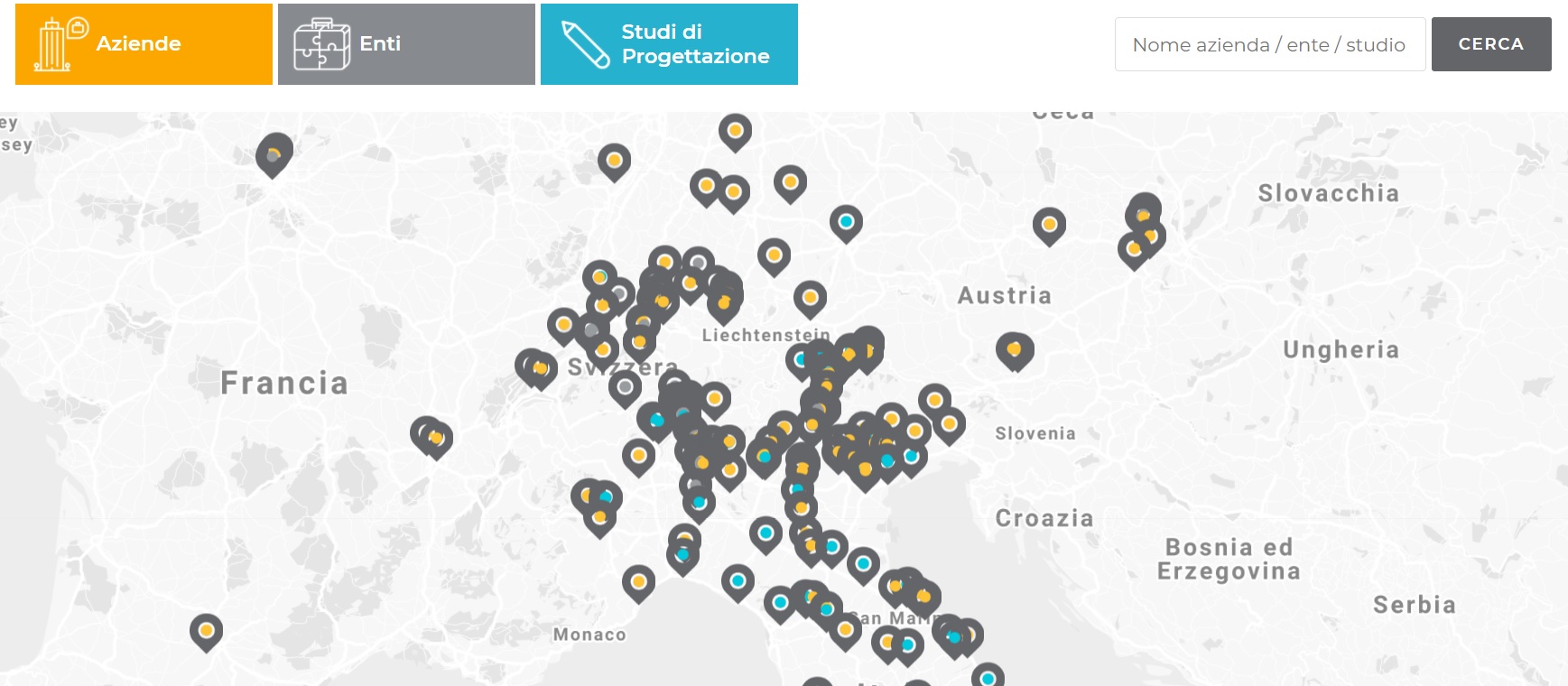 Geolocalizzazione, indirizzo e contatti per ciascuna azienda, ente pubblico o privato o studio di progettazione vengono condivisi. Collegamenti a siti aziendali o istituzionali vengono inoltre forniti insieme al logo, contribuendo a rafforzare la conoscenza e l’identità visiva degli stakeholders. Un filtro grafico per le tre macro-categorie di stakeholders individuate e anche un campo di ricerca testuale agevolano gli utenti nella ricerca.